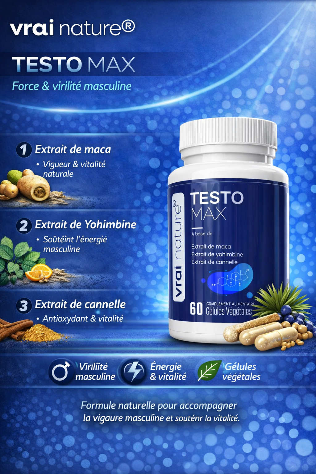 TESTOMAX de VRAI NATURE® est un complément alimentaire d’origine végétale, formulé à partir d’extraits végétaux concentrés 10:1, soigneusement sélectionnés pour accompagner la vitalité masculine, la libido et le bien-être général, dans le cadre d’un mode de vie sain et équilibré.